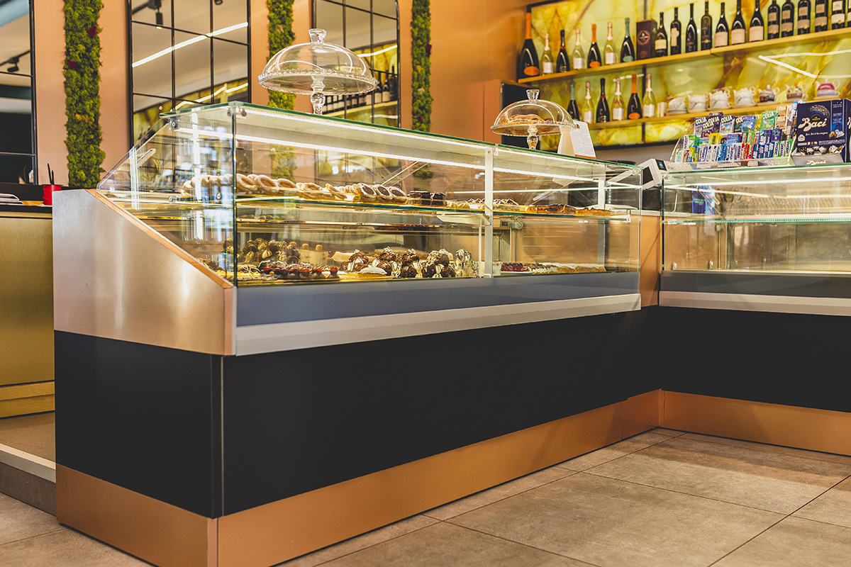 Another requirement for the renovation was to expand the product serving and display area. Within the same square footage, Belluccia designed a counter with large windows that invitingly show the pastries on sale, while offering greater space for customer service. The counter in FENIX Nero Ingo and Homapal Alu Brushed Coppertone gives refinement and an intriguing visual play of opacity and shine.