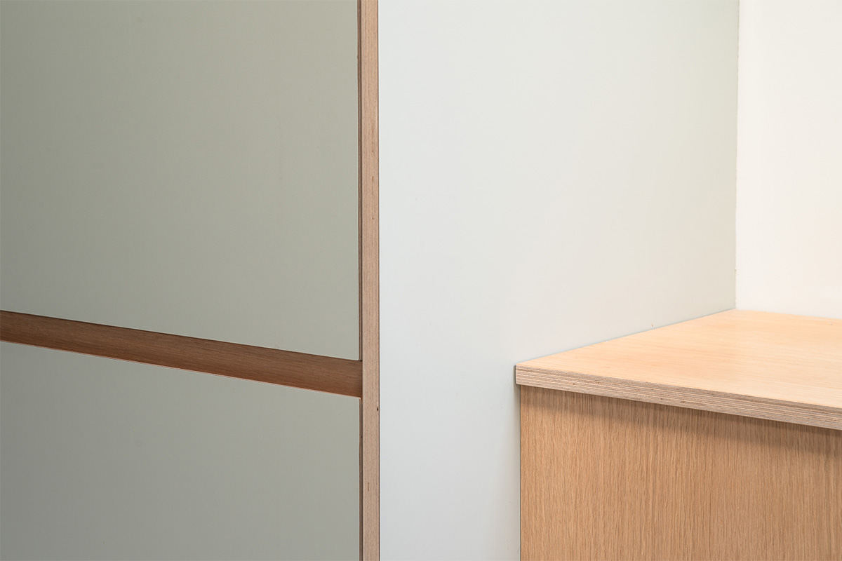 Formica laminate in the soft, muted green tone of Seed was pressed onto birch plywood for the doors, drawer fronts and end panels. The finish complements quarter-sawn oak veneer on open shelving and side details, while the Matte 58 texture adds a tactile depth that reinforces the calm, natural atmosphere.